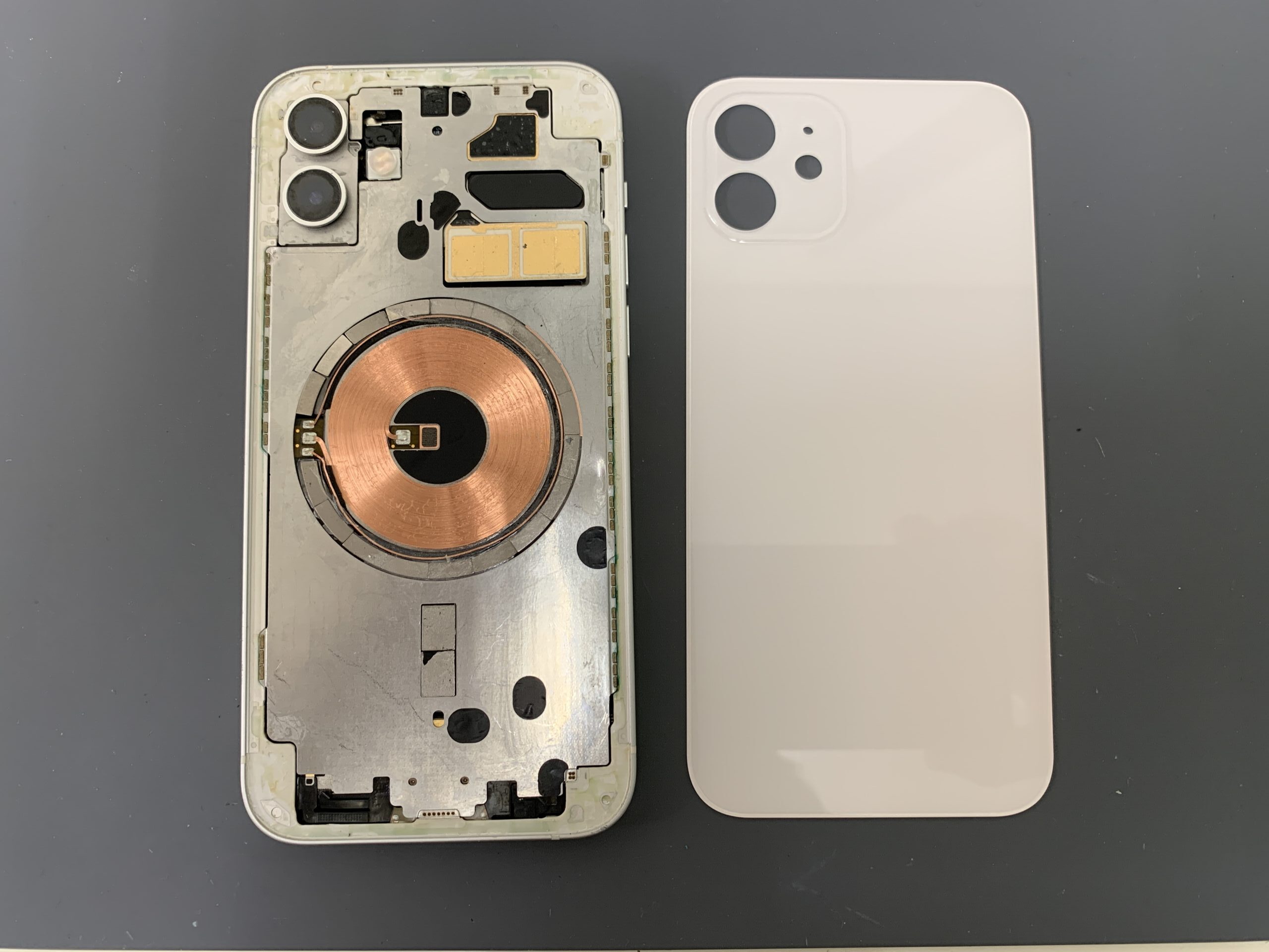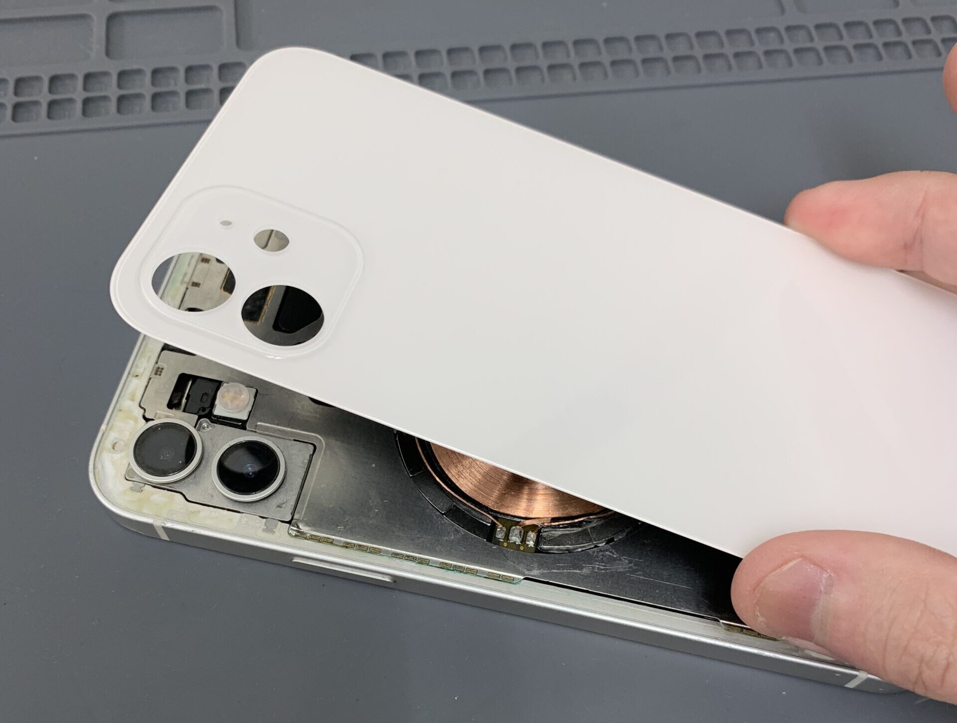 さて、状態がわかったところで、iPhoneを分解し、割れてしまった背面ガラスを取り外していきます。 内部の部品を取り外して、割れてしまった背面ガラスだけを慎重に剥がしていきます。