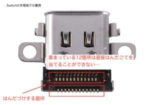先ほども申し上げましたが、Switchの充電端子のUSB-C端子は直接基板にはんだづけされています。 つまり、簡単には交換ができないということです。 Switchの充電端子は充電だけでなくHDMI端子も兼ねていたりして、はんだづけの箇所が24箇所あります。 そのうち12箇所ははんだごてでははんだづけができません。